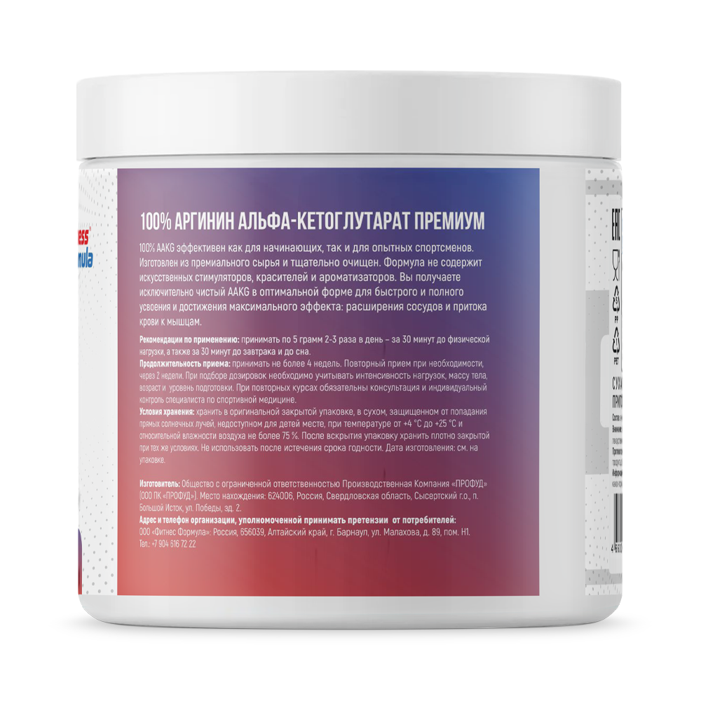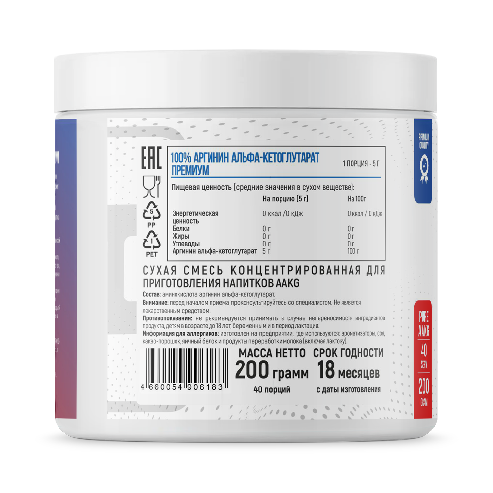 100% эффективен как для начинающих, так и для опытных спортсменов. Изготовлен из премиального сырья и тщательно очищен. Формула не содержит искусственных стимуляторов, красителей и ароматизаторов. Вы получаете исключительно чистый AAKG в оптимальной форме для быстрого и полного усвоения и достижения максимального эффекта: расширения сосудов и притока крови к мышцам.