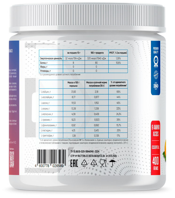 • Полный спектр EAA - 9 незаменимых аминокислот в оптимальном соотношении для быстрого усвоения.